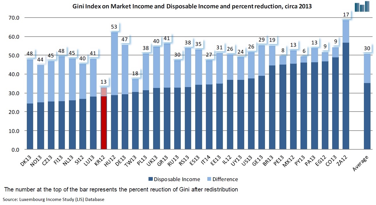 South Korea is often highlighted as being an outlier with respect to this, as the difference in Gini between market and disposable income is almost one fourth of the average difference in OECD countries (cf. OECD 2016). The 2012 microdata from South Korea, recently uploaded in the LIS Database, confirm this picture: the percentage reduction in Gini, when going from market income to disposable income, amounts to only 13 per cent, whereas it lies at around 40 per cent for most high income countries included in Wave IX of the LIS Database (see figure below). This low redistributive effect is more similar to that of the Latin American countries included in the LIS database, as well as South Africa and Egypt.