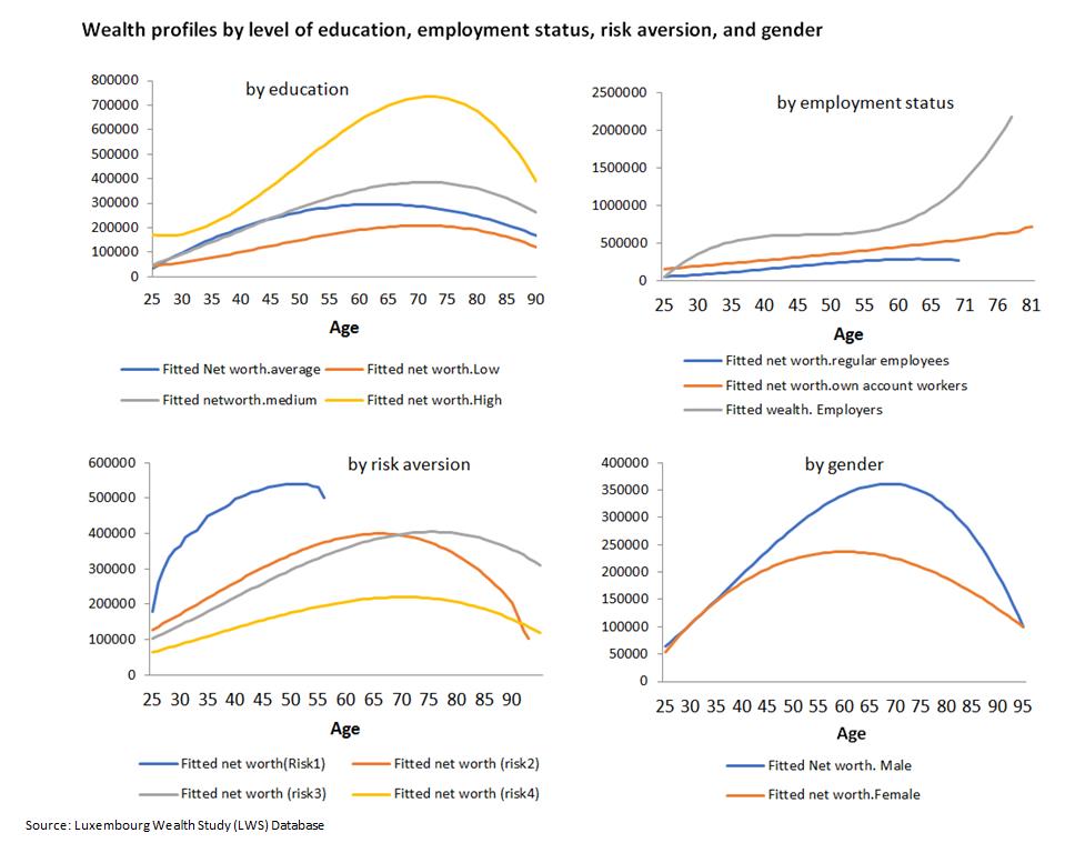 Age-wealth profiles calculate the average net worth over the age. The theory argues that on average, households who accumulate more wealth are more patient2 (Samwick, 1998). We present here the wealth accumulation profiles across level of education, employment status, gender and risk aversion behavior as shown in the figures below.