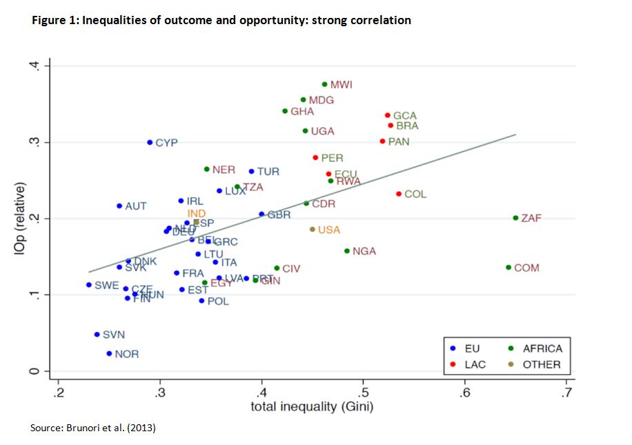 The positive, significant and substantial cross-country correlation between IOp (as a share of the total) and total income inequality that can be seen in Figure 1 reflects this circular causal flow between the distribution of opportunities and the distribution of outcomes. Indeed, although the pursuit of equality of opportunity does not imply a need to fully equalize incomes (as noted at the outset), their interdependence makes it unlikely that high levels of income or wealth inequality would be consistent with persistent, sustainable equality of opportunity.