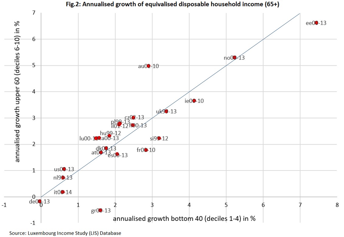 A broader research agenda is needed for carefully interpreting Figure 2. Reasonably high numbers in growth might be linked to high wage growth, depending on existing indexation rules in the various pension schemes. Also, the countries below the diagonal may have concentrated rather on better inclusion or higher generosity of targeted pensions to the income poor elderly; hence these countries have undertaken a relatively higher investment in increasing income of the poor elderly as compared to increasing payments from contribution-based schemes. Cost containment in pension systems might particularly affect the upper 60 group in future, when e. g. partly privatised pension provision for future retirees does not result in a replacement of previous public provision. On the other hand, cross-national and intertemporal variation in continued employment beyond the legal retirement age among the elderly across this period may heavily affect this narrative. Future research may aim at better capturing the joint analysis (multivariate modeling) of institutional characteristics of pension systems, living arrangements and labour market attachment, and its overall implication for pension outcomes and inequality trends among the elderly.