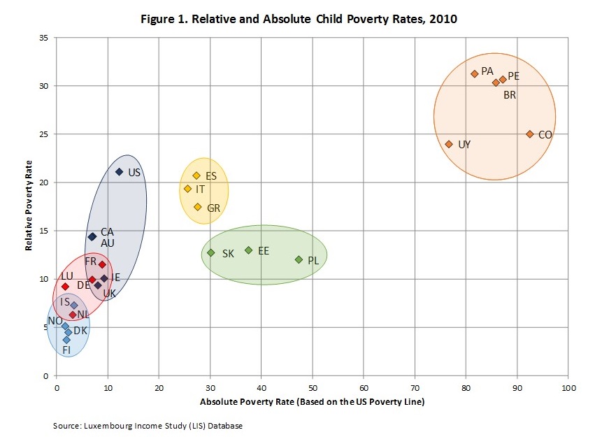 Two conclusions stand out from Figure 1. One, poverty definitions matter. Comparative child poverty results differ sharply between the two analytic frameworks. These results highlight the importance of considering absolute poverty comparisons when studying countries with widely divergent standards of living.