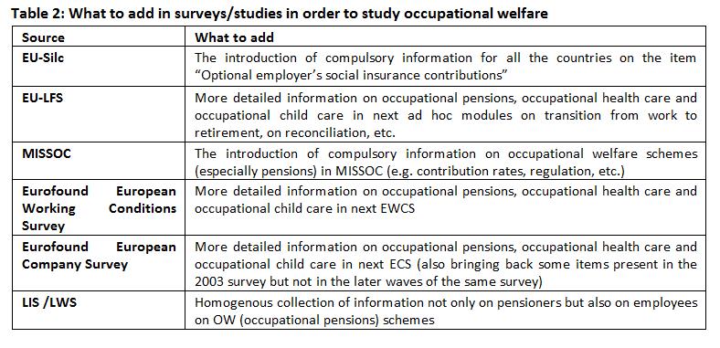 Nevertheless, with all these limitations and difficulties in data collection, there are potential ways forward. There are several sources of information on welfare issues at the EU level that could be used, even without creating new ad hoc surveys for data collection on occupational welfare schemes. It would be necessary to add specific questions/items inside these databases and surveys as illustrated more in detail in Table 2.