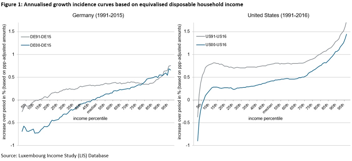 First of all, Figure 1 shows that annualised real income growth has not been substantial throughout the period from 1991-2015/16 in both countries, particularly, when looking at the more recent period from 2000 to 2015/16, growth remained far below the growth rates over the longer period. Median income in the United States grew by 0.79 % p. a. from 1991 to 2016 and by 0.42 % p. a. from 2000 to 2016, whereas in Germany median income grew much less from 1991 to 2015 (0.32 % p. a.), and showed almost no increase at all from 2000 to 2015 (0.03 % p. a.). It is worth mentioning that strong increases in real income growth in the latest years heavily moved the curve US00-US16 upwards; when looking at the curve US00-US13, the curve showed negative growth even up the 60th percentile, data available upon request.