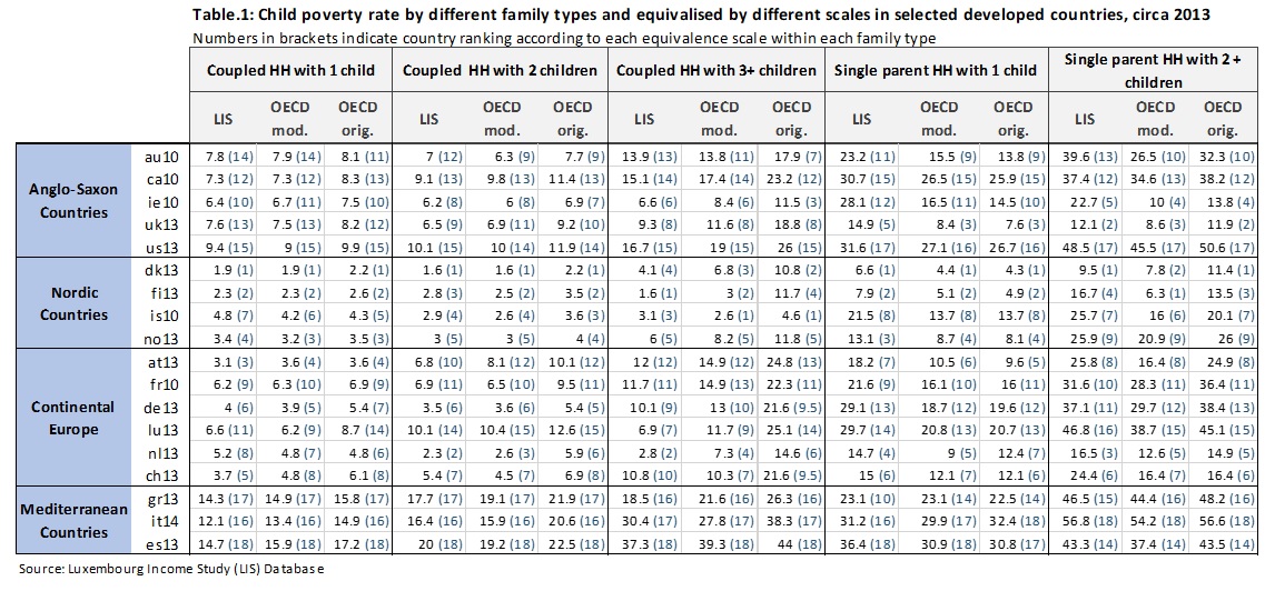 According to a forthcoming background paper (Nieuwenhuis et al., 2018)1, it has been evident that families with children are at higher risk of poverty than families without children across developed and developing countries, this is attributed to the costs associated with raising children and fulfilling their needs. A further decomposition of families reveals that single parent households have higher poverty rates and also at greater risk of poverty than coupled households. Single parent households are faced with many challenges, for example being disadvantaged in the labour market which results in limited financial resources (Nieuwenhuis & Maldonado, 2018). For example, in Canada and Unites States, over 50% of female headed families with young children are living in poverty (Nieuwenhuis et al., 2018)). However, in the process of estimating poverty measures, lots of methodological decisions are taken, including choosing the poverty line (relative, absolute), unit of analysis (individual, household) and the choice of the equivalence scale. Consequently, the focus of this article is not only to investigate- for a selected number of developed countries circa 2013- how child poverty levels differ in single parent households compared to coupled households, but also to further explore the effect of using different equivalence scales both on the level of poverty and the rank of countries.
