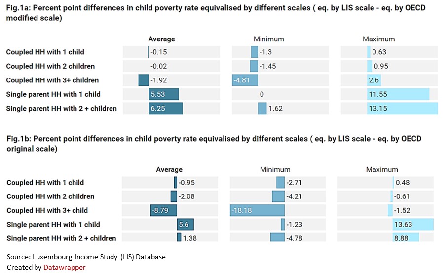A similar pattern with an opposite direction is observed for coupled households with more children, where child poverty rates are higher using the OECD scales compared to the LIS scale, with an average of approximately 9 percent points when comparing the LIS scale to the OECD original scale, the highest difference is observed in Luxembourg with 7% compared to 25%. This increase in poverty, when equivalising with the OECD scales is because these households are composed of larger number of both adults and children, for which the OECD scales assign high weights causing the overall equivalence factor to be larger than the factor of the LIS scale. These households in turn end up with lower amounts of equivalised household income and hence fall below the poverty threshold.