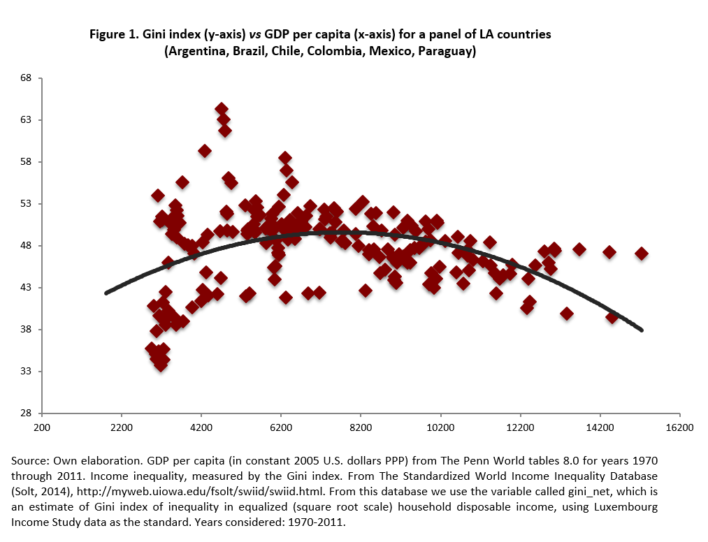 On the other hand, some raw data for several LACs seem to support well that income inequality has first increased, along low levels of income, to then decline once reached a certain pcGDP level. However, the latter largely varies across countries, whereas the KC literature tries to estimate a common and punctual switching value. Thus, this raises our key question in this respect: is it really pcGDP that – beyond a certain level – induces income inequality to decrease after an often long increase?