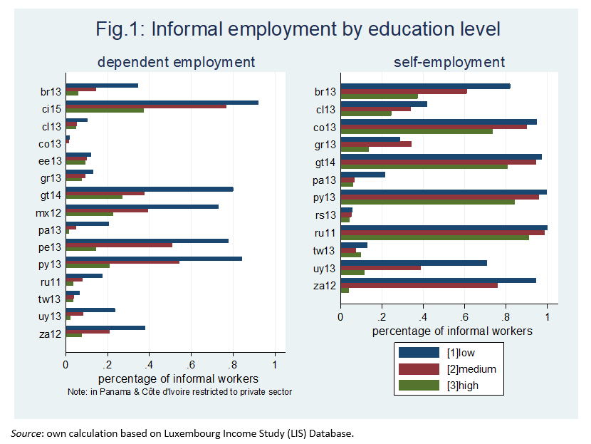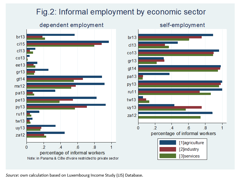 Figures 1 and 2 compile datasets for LIS Wave IX (around 2013), Russia 2011, and Côte d’Ivoire 2015, for all of which LIS has data concerning informal activities. A few countries were excluded from this overview due to the low relevance of informal activities (e.g. Luxembourg, Slovakia, and Estonia for the self-employed; in general, in Western Europe the labour legislation is stricter and consequently, the incidence of informal employment tends to be significantly lower).