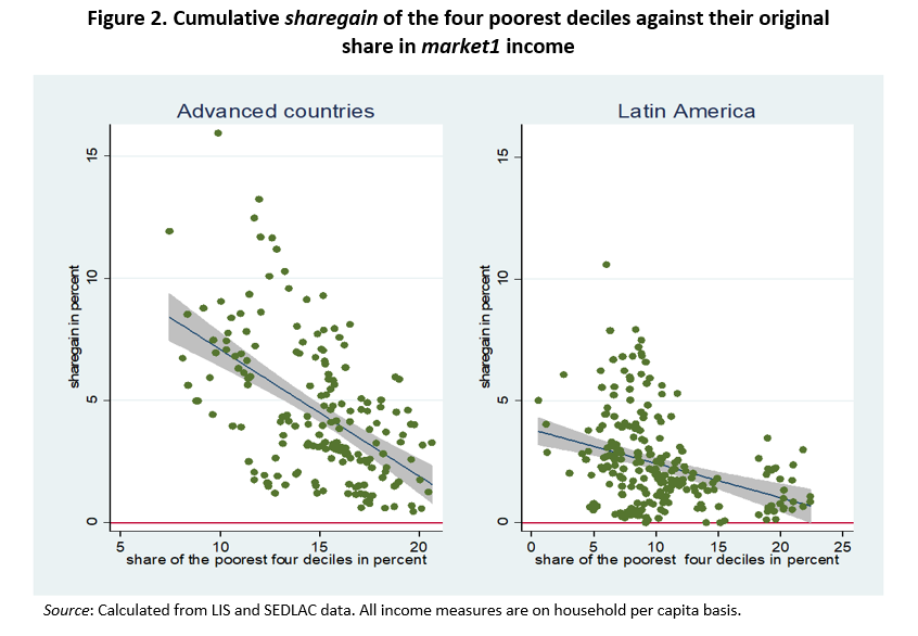 This has led Milanovic (2000) to formulate the “redistribution hypothesis” arguing that the gains are greater the lower is the market-income share of a decile but that we cannot ex hypothesi assert what would be the effect on the median voter. The key new variable named sharegain measures the difference in the share of income received by people in a given market income decile as the redistribution proceeds: first we look at their share in gross income (market income plus government transfers) and then their share in disposable income (gross income minus direct taxes). We thus observe how income shares of the same people change through the redistribution process: that is, whether they are “winners¨ or ¨losers”. This can obviously be done only if we have micro (household level) information. To clarify, if the bottom decile by market (pre-fisc) income share is, say 2 percent of total market income, and the share of the same people, after taxes and transfers, is 5 percent of disposable income, the sharegain for this decile is 3 percentage points.