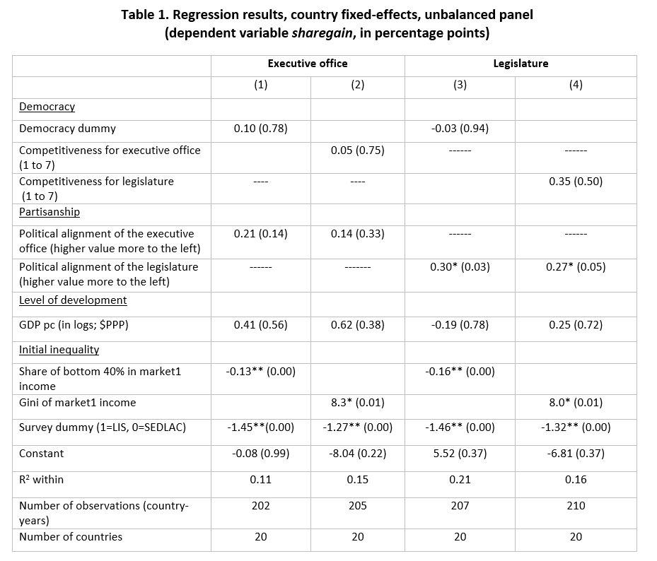In this paper, we apply the same approach to test the hypothesis on Latin American data. But in order to motivate it further and situate it in its political context, we look at redistribution together with political variables: level of democracy, and left-wing or right-wing political orientation (“partisanship”) of governments and legislatures. Not only is this a more realistic approach to redistribution, but it has been widely argued that the key impetus to Latin American inequality reduction (and greater redistribution) came from the left-wing governments that, approximately at the same time, came to power in Argentina, Bolivia, Brazil, Chile, Ecuador and Venezuela.