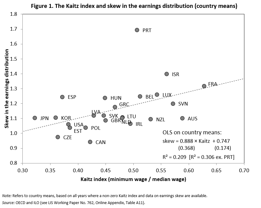 Figure 1 illustrates this point: countries with higher minimum wages typically also display a higher level of earnings skew (aside from the odd case of Portugal). A more complex regression model that makes use of the within-country variation of minimum wages supports the same finding, even when allowing that some countries (such as the Scandinavian countries and Austria) do not set minimum wages but have close functional equivalents in the form of comprehensive collective bargaining systems to set a floor for wages. There is also some indication that employment protection legislation (EPL) has similar effects and helps to raise the relative income position of low-paid workers. All of this lends credibility to the argument that earnings skew is not exogenous to welfare states but is itself at least in part a policy outcome.