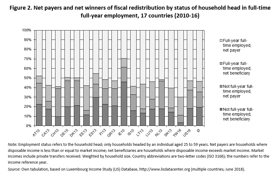 The proposition that between-group transfers matter can be put to an empirical test. Again, the Luxembourg Income Study (LIS) Database provides a reliable cross-national source. One conceptual complication is that the data measures employment status at the level of individuals but incomes at the level of households. Therefore, Figure 2 uses the employment status of the ‘household head’ to distinguish between households headed by somebody in full-year full-time employment (FYFT) and the remaining households, restricting observations to households with heads in the main working-age bracket. It then identifies households which are net payers and net beneficiaries from fiscal redistribution, according to whether disposable household incomes are lower (net payers) or higher (net beneficiaries) than market incomes. Despite this somewhat crude operationalization, the main finding is clear-cut: More than three-quarters of the net payers are found in households with a fully employed head, but almost two-thirds of the net beneficiaries live in households with a head who lacks full-year full-time employment. Moreover, the redistributive flows between groups are substantial: Averaging across all 17 countries, the tax and transfer system reduces the incomes of households with a head in FYFT by almost a quarter, whereas the remaining households are better off after taxes and transfers.