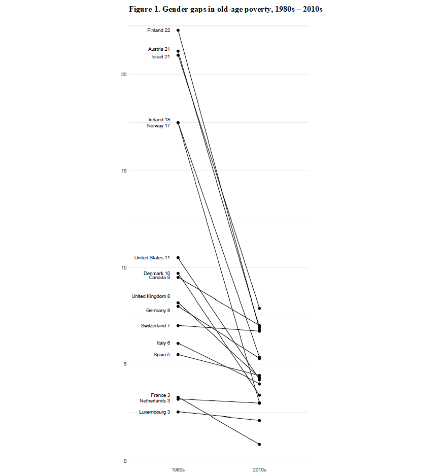 Old age no longer comes with the poverty risks that it used to a few decades ago and with the overall decrease in old-age poverty, concerns about economic inequalities and poverty have shifted to younger age groups (Fritzell and Ritakallio 2010). Yet, among those in old age, vast differences remain. In particular, older women are exposed to greater poverty risks than men (Ebbinghaus, Nelson, and Nieuwenhuis, 2019). Here, we focus on how this gender gap in old-age poverty has developed in recent decades across a number of OECD countries, a subject so far largely overlooked in the literature. Although different studies have shown that this gender gap remains (Smeeding and Sandström, 2005; Zaidi 2010), little is known about the trends of women’s and men’s respective poverty risks. We propose an analytical approach that highlights several distinct patterns that may drive changes in the gender gap in old-age poverty.