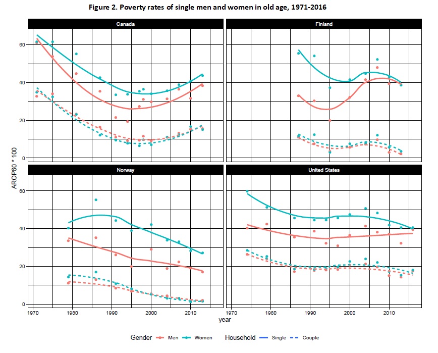 The following analyses focus on trends in poverty risks of single men and women in their early retirement age (65-74). After presenting general trends in the gender gap in old-age poverty in 16 countries, we focus on four (Canada, Finland, Norway, and the United States) that are indicative of distinct patterns in the data. Using LIS data, At Risk Of Poverty rates (AROP) are calculated at the 60% level and based on the median cash disposable household income. The gender poverty gap is calculated as the subtraction of men’s poverty rates from women’s poverty rates.