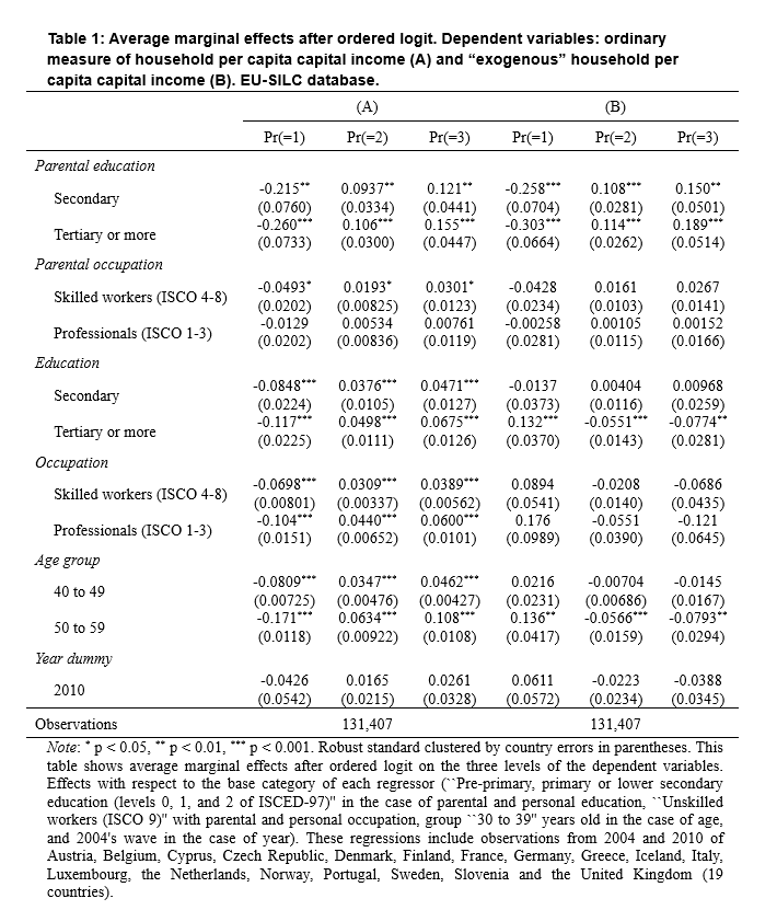 In his famous book “Capital in the Twenty-First Century”, Thomas Piketty (2014) wrote about the return of what he dubbed patrimonial capitalism, referring to the importance of bequests in the determination of wealth. If patrimonial capitalism is truly back, then capital income could serve as a proxy for family background. And in addition to that, other mechanisms may be at play too: on the one hand, from the intergenerational mobility literature we know that more educated parents tend to transmit more social advantages, such as education, to their children (see for example Chetty et al., 2014, or Jäntti and Jenkins, 2015), while returns on investments appear to be linked to education and financial literacy, something we know from the portfolio literature (Von Gaudecker, 2015; Bucher-Koenen and Ziegelmeyer, 2011); on the other hand, savings and wealth ownership have been found to be largely determined by the intergenerational transmission of human capital, something explored by the wealth inequality literature (Charles & Hurst, 2003; De Nardi & Fella, 2017; Hällsten & Pfeffer, 2017; Hansen, 2014).