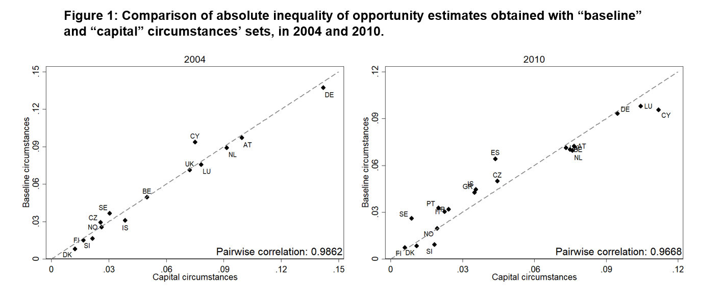 • Second, we test the accuracy of our approach by comparing IOP estimates obtained with a “standard” set of circumstances (i.e., including parental education) and our set (excluding parental education but including a measure of capital income). For this purpose we consider datasets in which information on both parental background and capital income is available. In the EU-SILC database these correspond to the waves of 2004 and 2010 only. We conclude that our approach is accurate to the extent that it returns similar results to those of the “standard” method that we adopted as our baseline;