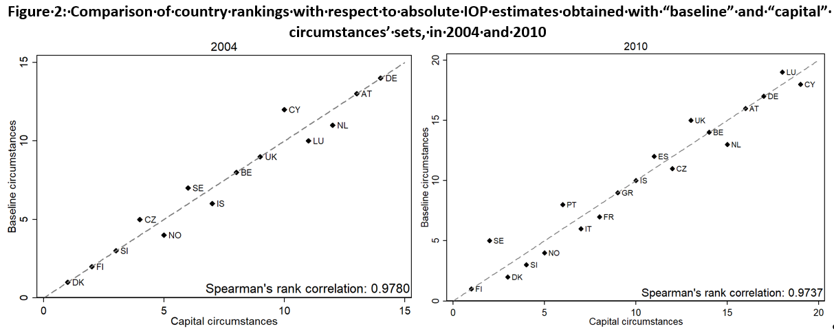 A common use of cross-country IOP measures are international rankings. Figure 2 shows comparisons of IOP ranks. It would be an interesting feature of the capital income approach to be a rank-preserving method with respect to baseline estimates, although it is not the case. Nevertheless, the rank correlations between our “baseline” and “capital” estimates are also close to 1, meaning that if a country ranks high (low) according to the “baseline” IOP measure, it will rank high (low) as well if measured with the capital income approach, and vice versa. For a more comprehensive accuracy test and a robustness analysis, the reader is referred to the working paper version of this article.