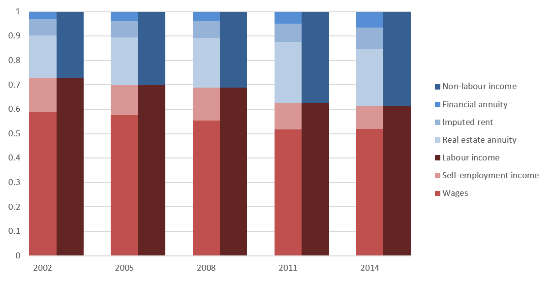 If we consider the sources of our extended measure of market income (Figure 1), most remarkable is the downturn trend in labor and self-employment income especially after 2008, as a consequence of the deteriorating conditions in the labor market. In contrast, it highlights the enormous importance of real estate annuities, which in 2011 represented 23% of market income. However, it lost weight in 2014, and in absolute terms it fell to the levels seen before the financial crisis, due to decreasing house prices. However, it still preserves a significant weight in total income, because the fall in labor income was even sharper. Interestingly, the weight of the annuity from financial assets has grown more than 50% since 2002, representing around 7% of market income. These assets could be an alternative for the lower profitability of housing assets, revealing a change in the composition of household asset portfolios. Finally, the imputed rents have also gained importance since 2002 and accounted for 8% of market income in 2014. The main residence maintained its dominant influence on well-being in Spain despite the severe financial conditions after 2008.