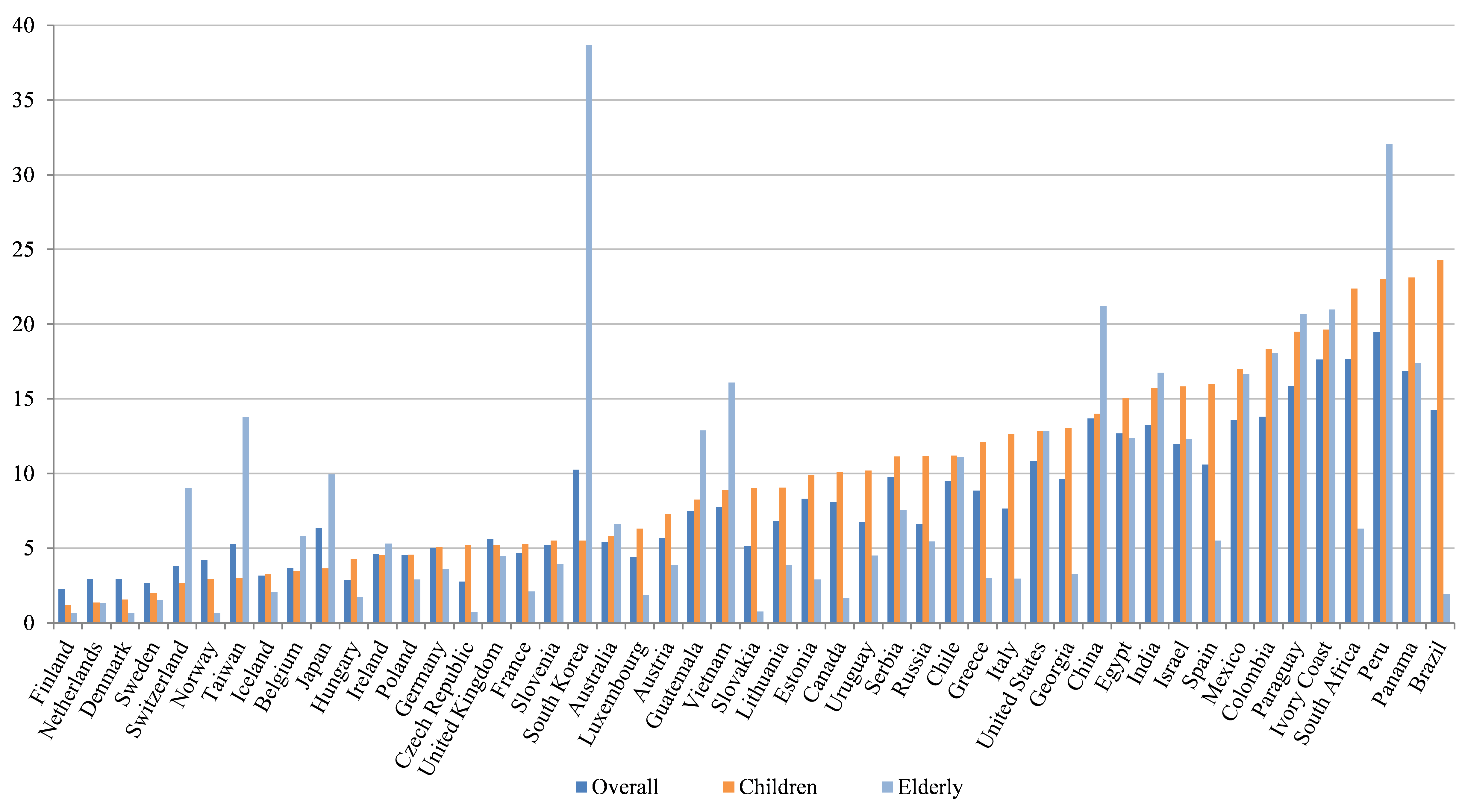 LIS Key Figures provide estimates of poverty rates for three relative poverty lines: 40%, 50%, and 60% of the country median equivalised household disposable income.1 Figure 1 shows poverty rates for children (under 18 years), the elderly (65 years and over), and the overall population in LIS countries based on the 40% of median income threshold, which can be interpreted as severe poverty (Mazeikaite 2019). It can be seen that of all 49 LIS countries, Brazil has the highest child poverty rate (24.3%). In contrast, the relative poverty rate among the elderly in Brazil (1.9%) is one of the lowest. LIS Key Figures also estimate that in 2013 the child poverty rate in Brazil was lower (20.2%), which means that children’s wellbeing decreased relative to the rest of the population between 2013 and 2016. Among the elderly, however, the tendency in that period was an improvement in their relative position.