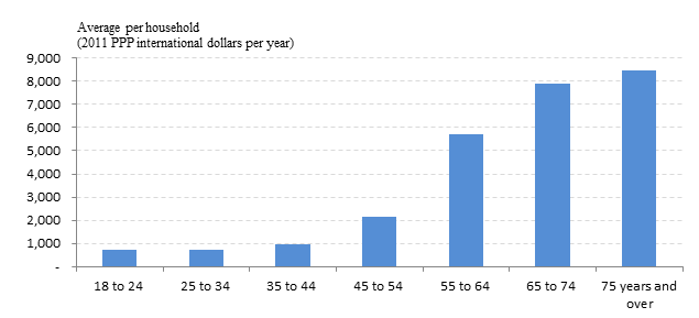 Figure 2: Equivalised social security transfer by age of the head of the household, 2016, Brazil