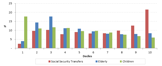 Figure 3: Distribution of children, elderly and total social security transfers by decile group, 2016, Brazil