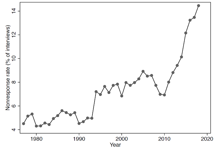 Unit non-response rates in household surveys (i.e., the share of non-respondent households among total households that are sampled) have been increasing in recent decades (Meyer et al. 2015) and household surveys in the US are no exception. In the CPS, the aggregate non-response rate more than tripled between 1977 and 2018, increasing from approximately 4% to more than 14%.