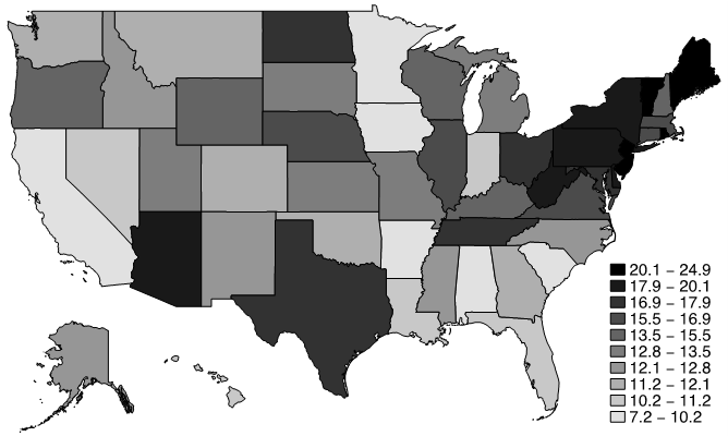 Munoz and Morelli (2019) present a new Stata command to implement this method, <kmr>. To illustrate its use, the authors use data from the 2018 CPS downloaded from IPUMS (Flood et al. 2018), merged with the number of interviews and Type A non-responses (interviewer finds the household’s address but obtains no interviews) obtained from the NBER CPS Supplements website. These data are sufficient to derive state-level non-response rates in the US, defined as Type A non-responses as a share of the sum of interviewed households and Type A non-responses. Figure 3 below reports geographical variation in non-response rates across the US states.