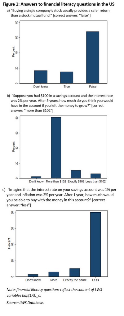 Financial literacy questions asked in the wealth surveys – and also covered in the LWS Database (e.g. Italy, the UK, and the US) – typically follow the standard questions on interest rates, inflation, and risk diversification proposed by Lusardi and Mitchell (2014). For example, the Survey of Consumer Finances (SCF) 2016 asks U.S. households three questions about financial matters (see Figure 1 for the exact wording). The answers to those questions reveal that respondents are more familiar with the concepts of inflation and interest rates than the concept of risk. Following the recent literature, researchers might be interested in linking financial literacy to financial behaviors and economic decisions such as asset holdings, retirement savings, portfolio diversification, as well as over-indebtedness (see Lusardi and Mitchell, 2014), or studying differences in financial literacy across population groups (e.g. Cupak et al., 2018).