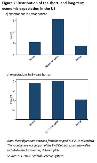 New behavioral variables in the LWS Database on expectations will be based on a set of questions recently asked in several wealth surveys. Typically, there are two different sets of questions asked with respect to expectations, the overall performance of the economy (e.g. economic growth and prices) and expectations regarding the future financial situation of the household. Let us take a look at some examples from the original questions that will appear as new LWS variables. For example, in the SCF 2016, the following questions are asked: “Over the next five years, do you expect the U.S. economy as a whole to perform better, worse, or about the same as it has over the past five years?” and “Over the next year, do you expect the economy to perform better, worse, or about the same as now?”. As shown in Figure 2, households in the US have different expectations regarding future macroeconomic trends.