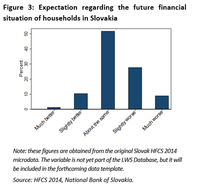 Another wealth survey (the Household Finance and Consumption Survey) asks a question about households’ expectations concerning their future financial situation: “Thinking about a year from now, do you expect your personal financial situation in general to be a lot better, somewhat better, about the same, somewhat worse, or a lot worse?”. The answer to this question is presented in Figure 3. In a sample of Slovak households, respondents showed mostly neutral, but also rather pessimistic expectations as regards the evolution of their future financial situation.