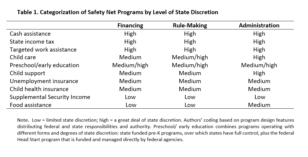 To examine this, we identify 10 primary federal-state safety net programs and categorize the extent of state discretion created through policy design in three domains: (1) financial, joint federal-state funding arrangements, partial state funding for programs, or state discretion in spending federal funds; (2) rule-making authority, authority to determine rules regarding eligibility, benefits, and other aspects of the program; and (3) administration, flexibility and discretion in the implementation, management, and frontline delivery of assistance.