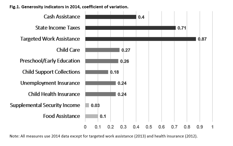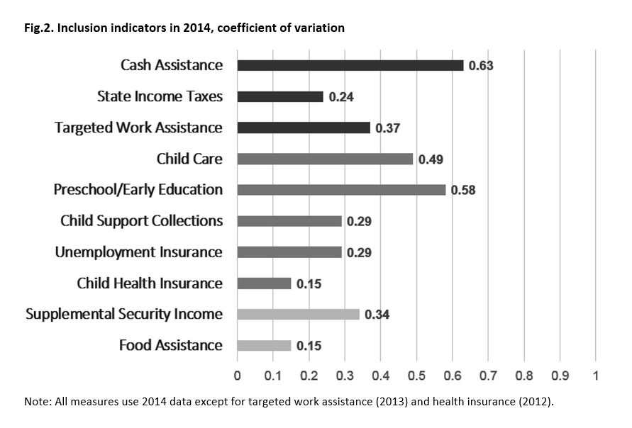 As we expected, in 2014 we observe greater variation in the generosity of benefits in those programs over which states have greater financing responsibility and control (see Fig. 1). The COV measures are largest in the three programs that have high levels of state discretion over funding (cash assistance, state income taxes, and targeted work assistance). In contrast, the two programs with the least cross-state variation are largely or entirely federally funded, leaving states with limited discretion for determining total spending or individual benefit levels: food assistance and SSI. In principle, states may supplement the SSI child benefits, but currently 18 states do not supplement the federal benefit for children, and four states only supplement benefits for specific types of disabilities.