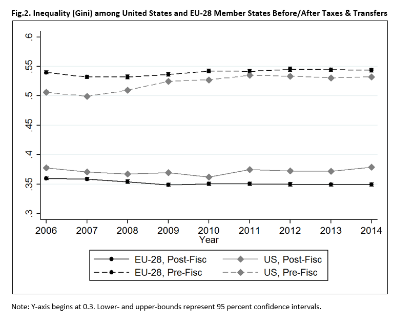 At the Journal of European Social Policy, Stefano Filauro and I set out to compare income inequality in the U.S. (after adjusting for benefit underreporting) to income inequality in the EU-28. LIS users know well that income inequality in the U.S. is higher than in most other advanced democracies. In Filauro and Parolin (2018), we find that even after adjusting for benefit underreporting, post-tax/transfer income inequality in the U.S. is higher than pan-European income inequality, as shown in Figure 2 below. In other words, when we aggregate all residents of EU Member States together and adjust for cross-national price differences, we find a Gini coefficient that is consistently smaller than that of the United States from 2006 onward.