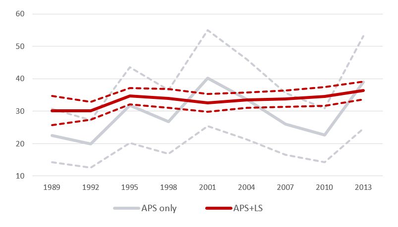 Fig. 1: Wealth share of the wealthiest 1% and associated confidence intervals; combined APS and LS and APS alone; SCF, 1989–2013