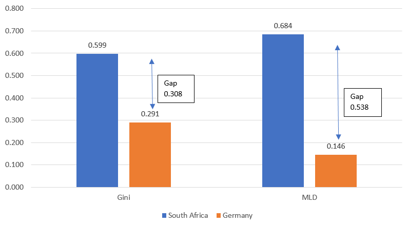 In this article, I will use a practical case and combine these different approaches that are usually investigated independently, based on the methods proposed in Gradín (2018, 2019), where they are explained in more detail. I will use data from the Luxembourg Income Study (LIS). Inequality will be measured for disposable income per equivalent adult.i I will focus on two indices that have the right properties, the Mean Log Deviation (MLD) and the Gini index.ii I will compare inequality in one highly unequal country (South Africa, 2012) and in one low-inequality country (Germany, 2013). Indeed, South Africa is the country with the highest level of income inequality in LIS, while Germany has one of the lowest levels among the largest economies. Inequality in South Africa is higher than in Germany as shown in Figure 1, with the gap being 0.316 (Gini) and 0.560 (MLD). The aim is to shed some light on the role in driving the cross-country gap in income inequality played by i) a head’s attained educationiii , probably the most relevant socioeconomic characteristic, and ii) two incomes sources (net of direct taxes): ‘market income’, broadly defined here as incomes derived mainly from labor, old-age pensions and capital, and ‘public social benefits’ (other than pensions).