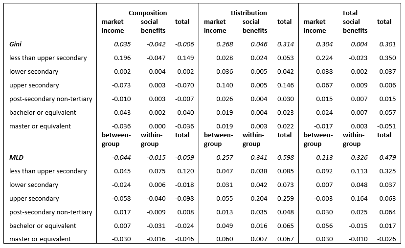 It is interesting to note that despite the strong connection and potential complementarities in the study of inequality among these three decomposition approaches, they have been investigated and used almost independently from each other. So far, I have shown three basic results: the inequality gap is i) mainly driven by inequality within educational groups (although between-group inequalities are also notable), ii) is generated before public social benefits are accounted for, and iii) is generated by the different income distribution of educational groups, not by their population shares being different in both countries.