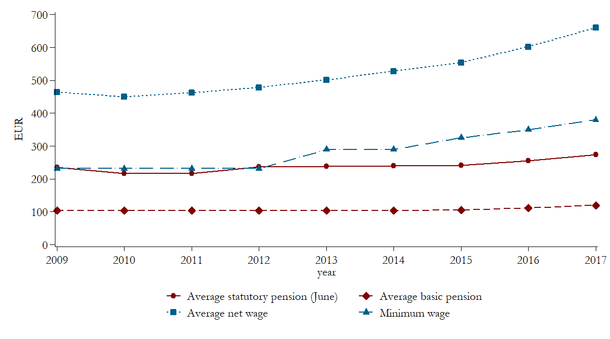 Figure 2 offers a potential explanation for increasing poverty rates among the elderly. As the Lithuanian economy started recovering from the Great Recession of 2008, monthly wages were steadily rising. This happened not only due to the growth in the economy but also due to institutional changes in the minimum wage, which was raised from 232 EUR in 2012 to 380 EUR in 2017. At the same time, pensions remained largely unaffected. The basic monthly pension stood at 105 EUR until 2015 and was increased only slightly until it reached 120 EUR in 2017. Due to this, the rise in the old-age pensions did not keep up with the income growth of the majority of the population, which is why we see a steady increase in the relative poverty rates among the elderly in 2010-2017.