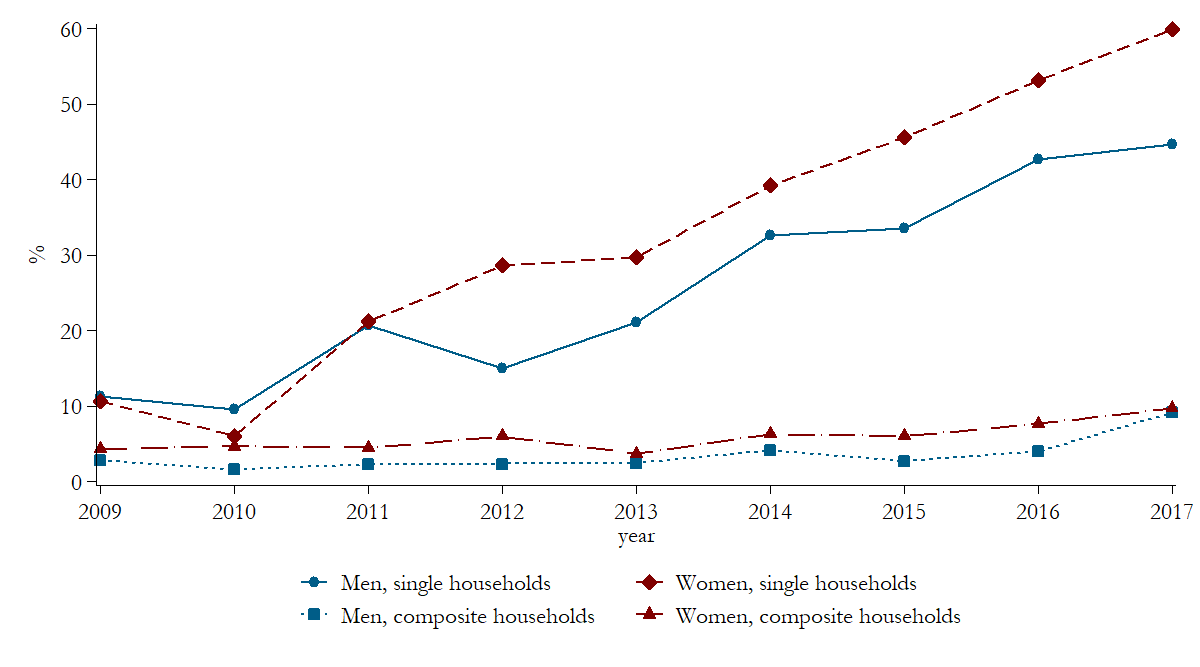 Whether the elderly were more likely to become poor during the analysed period depended largely on the household composition. Figure 3 shows that while poverty rates among the elderly living in composite households rose only slightly, it was the elderly living alone who suffered the most. The increase in relative poverty was especially pronounced for women in single households. By 2017, about 60% of women living alone were in relative poverty, compared to less than half of men living alone. The differences in poverty rates among elderly women and men are not surprising: women tend to have shorter employment histories and earn lower incomes compared to men, which result in lower old-age pensions. However, though present, the gender gap in old-age benefits in Lithuania is not considered large from an EU perspective (European Commission, 2018).