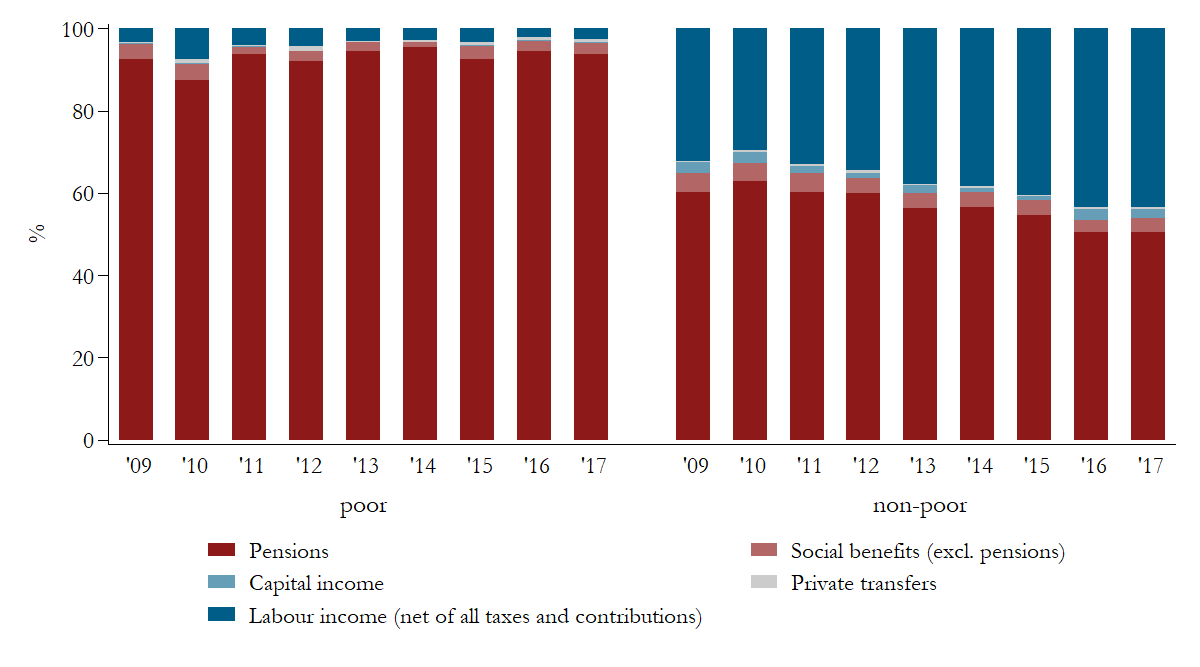 Lastly, Figure 4 shows the differences in the composition of disposable income among old-age individuals by poverty status. First, we see that poor individuals primarily rely on old-age pensions as their source of income. Only less than 10% of their income came from other sources such as labour, capital, private transfers and other social transfers. On the other hand, among the elderly living above the poverty line, pensions comprise less than two-thirds of disposable income, while labour income comprises around 30%. Second, in the period 2009-2017, the share of labour income among non-poor elderly individuals steadily increased, while it slightly declined among the poor. This suggests that while pensions stagnated, the only way for those who were close to the poverty line not to fall into poverty was to increase income from other sources, mainly labour. This does not mean that the elderly had to necessarily go back to work; it merely explains that old-age individuals living in composite households were much better protected against poverty than the elderly living alone due to the labour income of other household members. In addition to this, the share of capital income in total disposable income among non-poor individuals was higher than among poor individuals, which suggests that poverty can be reduced by promoting savings in old-age.