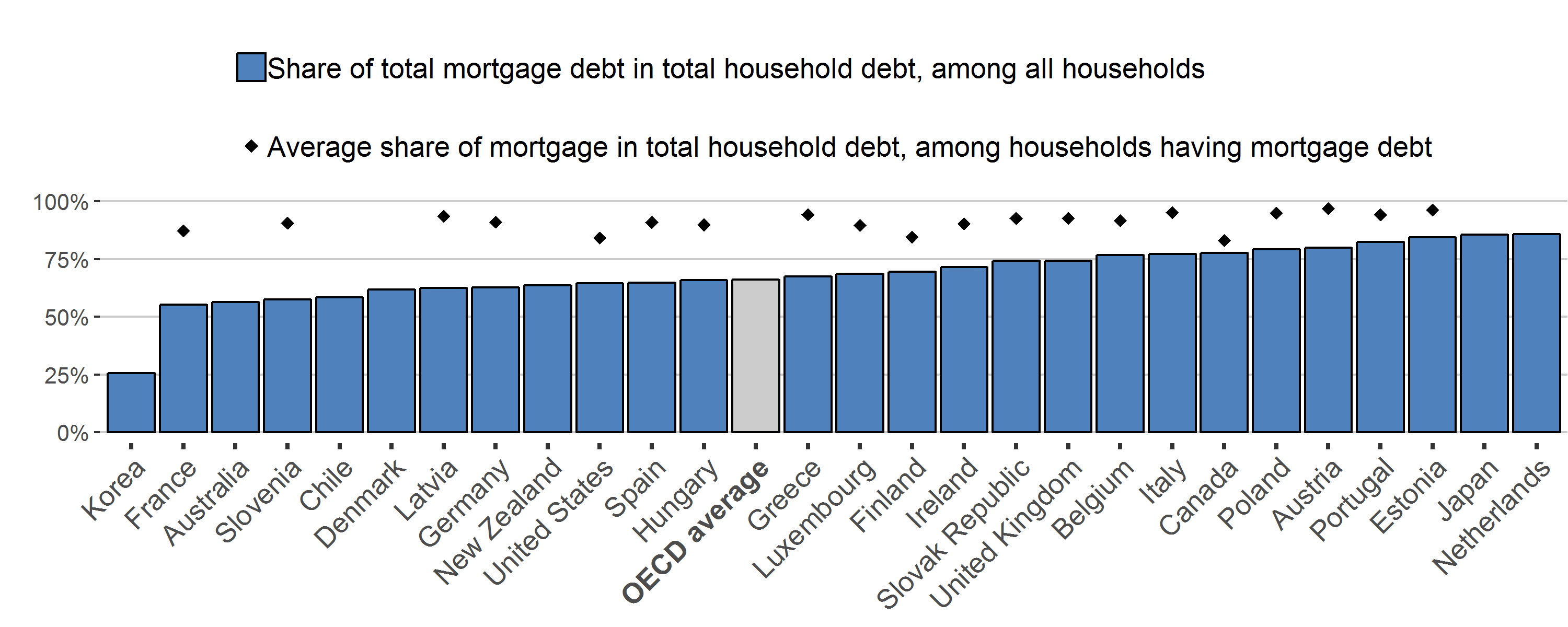 Mortgage debt is the most important component of household debt (Figure 1). At the macroeconomic level, that is, considering all households in the population whether indebted or not, mortgage debt represents more than half of total household debt in almost all OECD countries. At the household level, that is, among households that hold mortgage debt, mortgage debt represents more than 80% of their total debt. From a policy perspective, this makes it clear that monitoring household debt and housing market developments require a careful focus on mortgage debt.