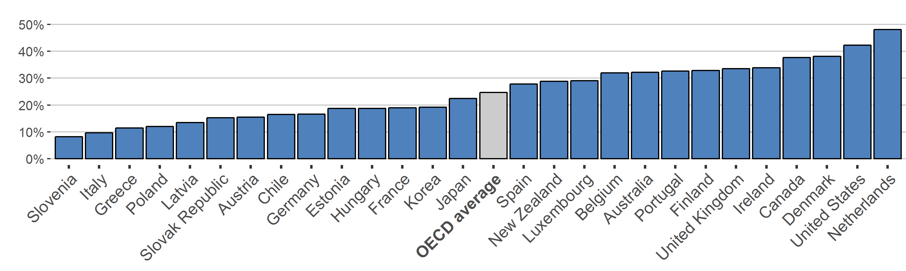The proportion of households that hold a mortgage varies significantly across OECD countries (Figure 2, Panel A). On average across the OECD, around 25% of households have mortgage debt, ranging from around 10% in Slovenia and Italy to between 40 and 50% in the United States and the Netherlands. One key stylised fact is that the participation in mortgage debt increases broadly monotonically with household income (Figure 2, Panel B). This is not surprising as mortgage markets are regulated and bank lending is conditional on household repayment capacity, measured primarily by their level of income. Yet the link between household income and mortgage debt is somewhat steeper in some countries than in others. This may be indicative of differences in the prudential regulation of mortgage markets for both the borrower and the lender, in addition to housing affordability.