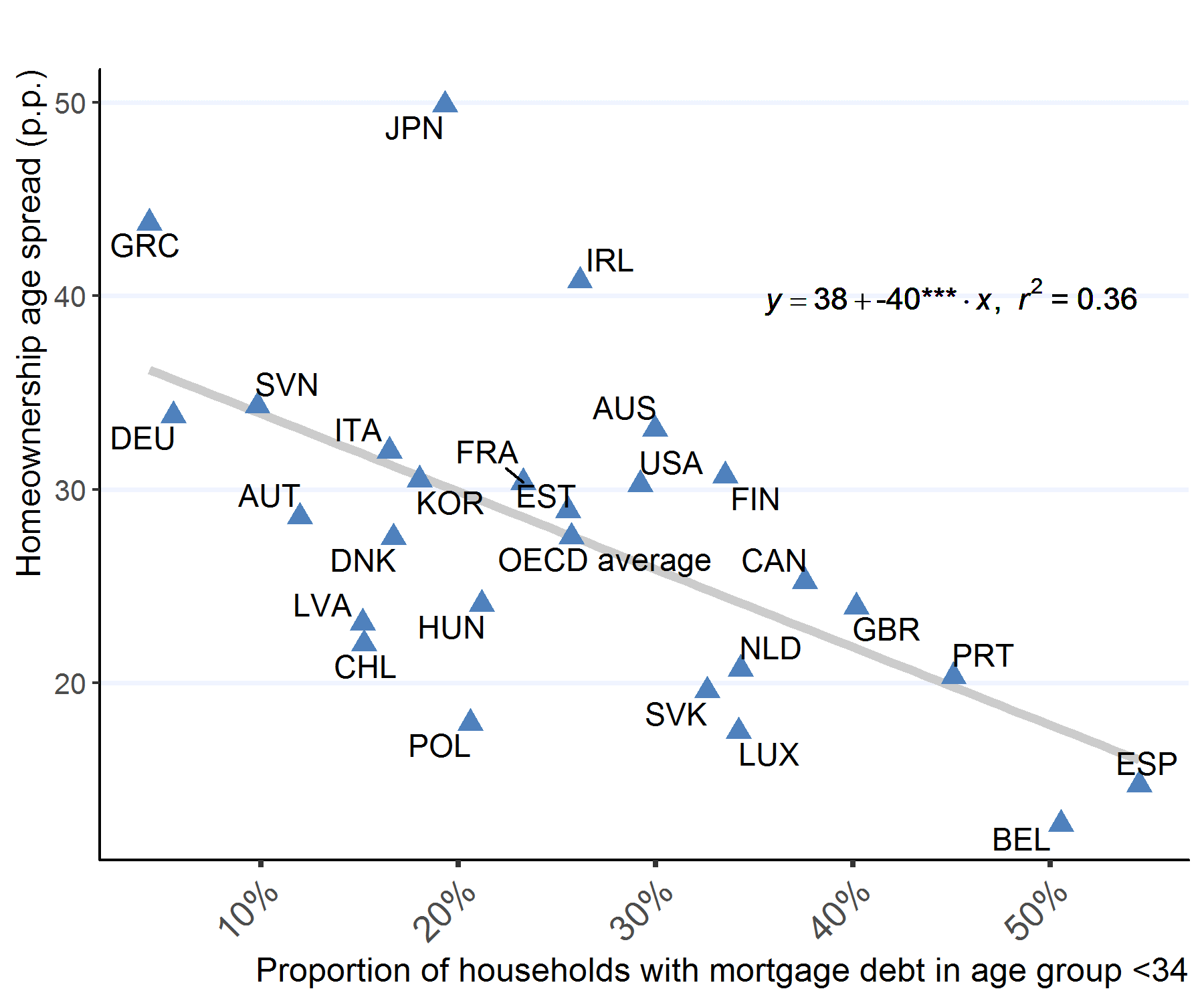 Access to mortgage debt for young households is likely to be one key driver of homeownership for this group, given their relatively low levels of wealth and income. Across OECD countries, the higher the participation in mortgage markets among young households, the lower the difference in homeownership between young households and the rest of the population (labelled “homeownership age spread”) (Figure 3). The literature shows that younger households are relatively more sensitive than other groups to policy settings affecting homeownership, in particular mortgage market regulations (Andrews, Caldera Sánchez and Johansson, 2011.3 Cross-country differences in homeownership age spreads are also likely to reflect differences in the dynamics of housing affordability. This has been emphasised recently in countries with large house price increases, such as the United Kingdom, where a so-called “broken housing market” is driving a generational divide in homeownership whereby young households have been priced out of the market (IFS, 2018).