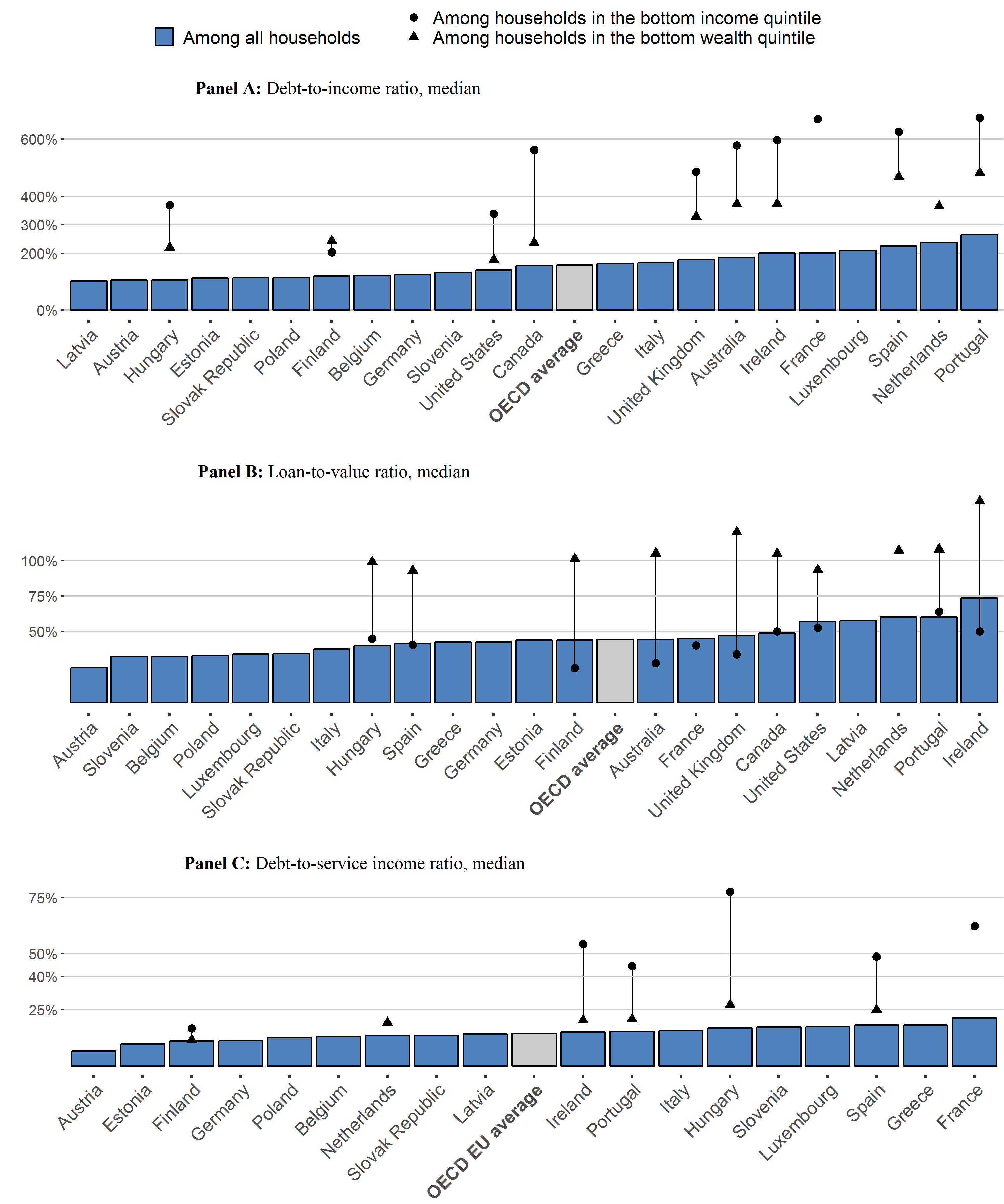 Panel B. Proportion of households with mortgage debt across the income distribution, OECD average and selected countries (%)