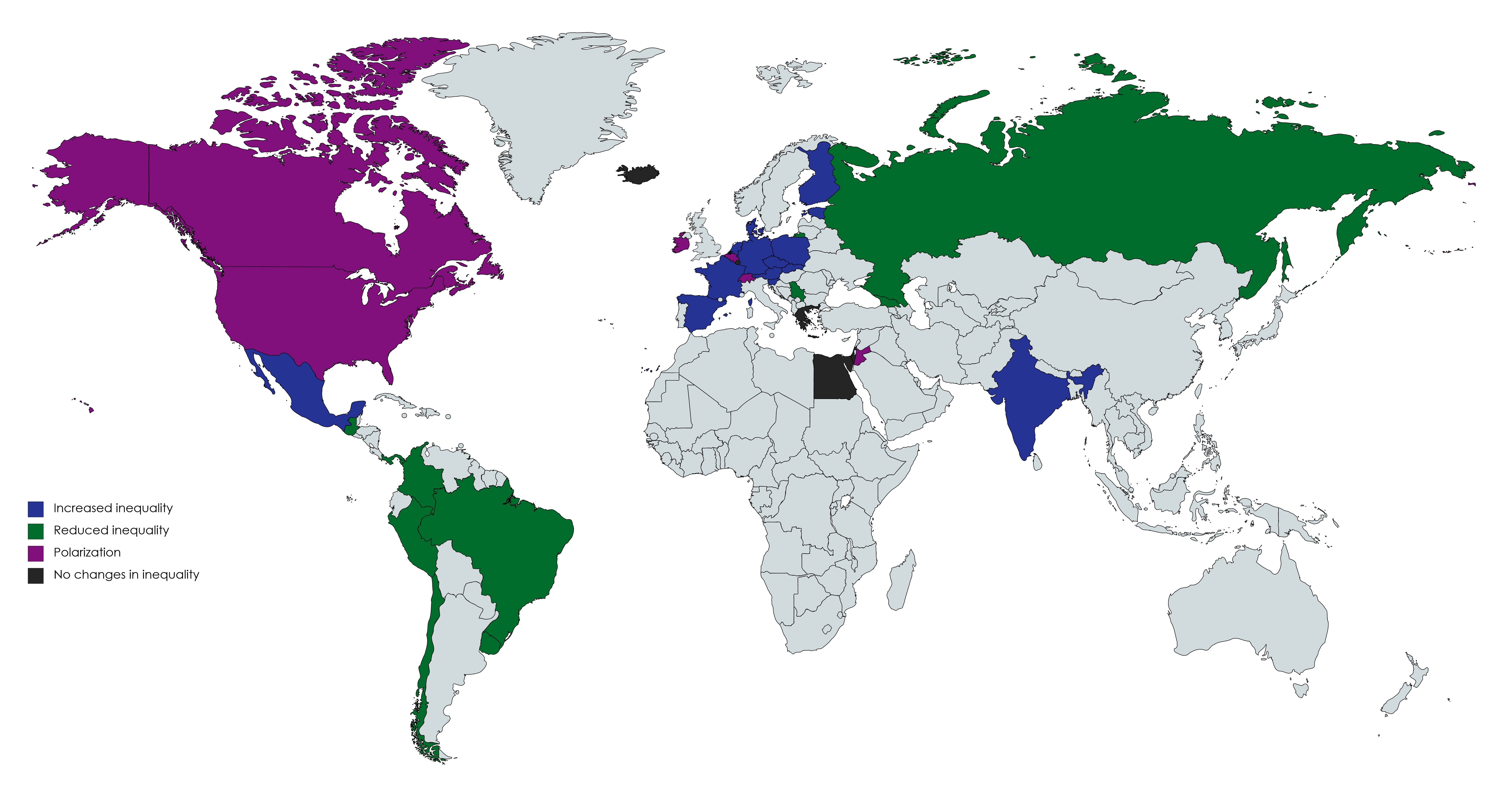 Note: Results by country, based on our analysis. Blue indicates increased inequality, green represents reduced inequality, purple indicates polarization, and black indicates no changes in inequality.