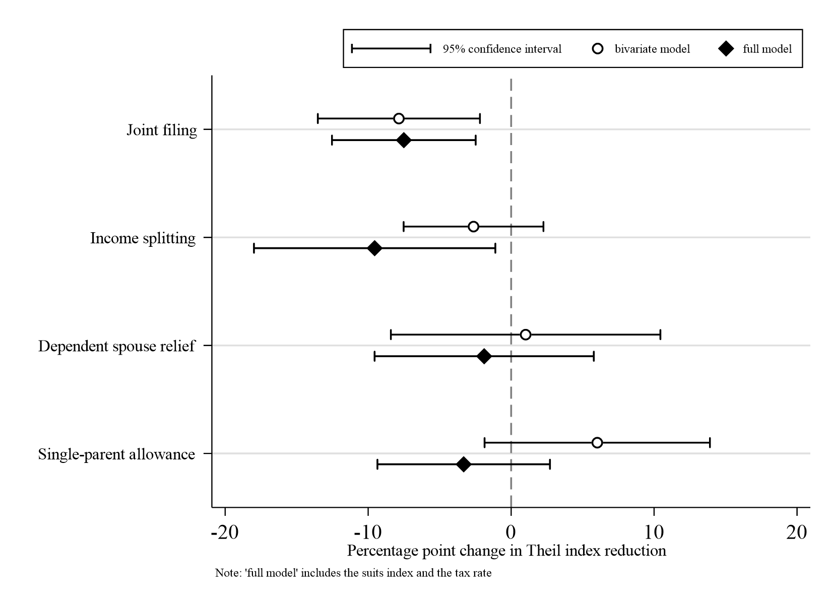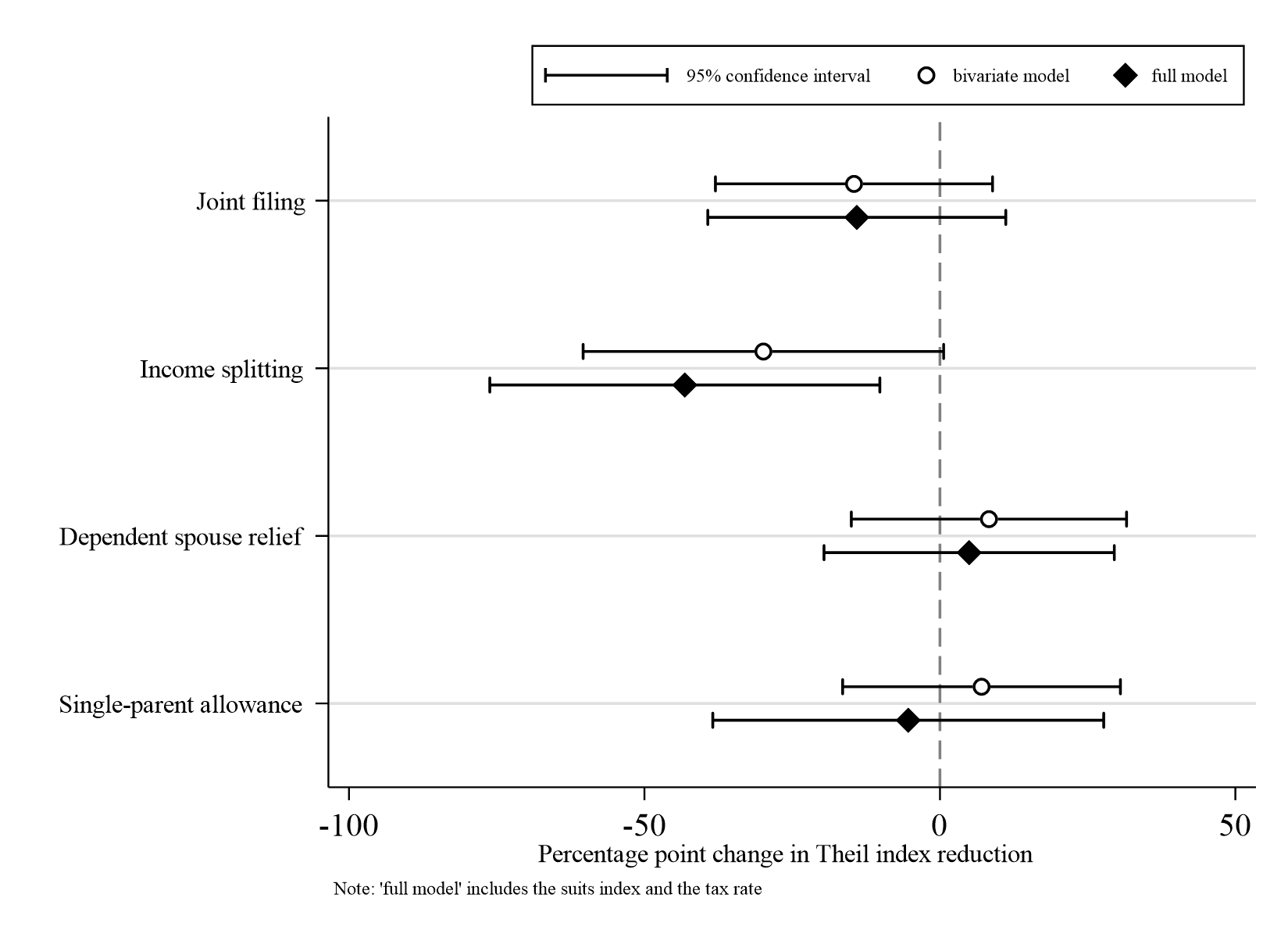 As Figure 1 indicates, income splitting and joint filing are negatively associated with the reduction in income inequality between types of families. This confirms the expected pattern of familialization policies thwarting the redistributional goals of social policy. Estimates for dependent spouse allowance and single parent allowance are, however, inconclusive.