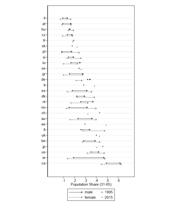 Figure 1 shows estimates around 1995 and 2015 of the share of men and women aged between 31 and 65 with tertiary education in 27 high-income countries for which we have data in LIS. 2 This unveils some empirical regularity.