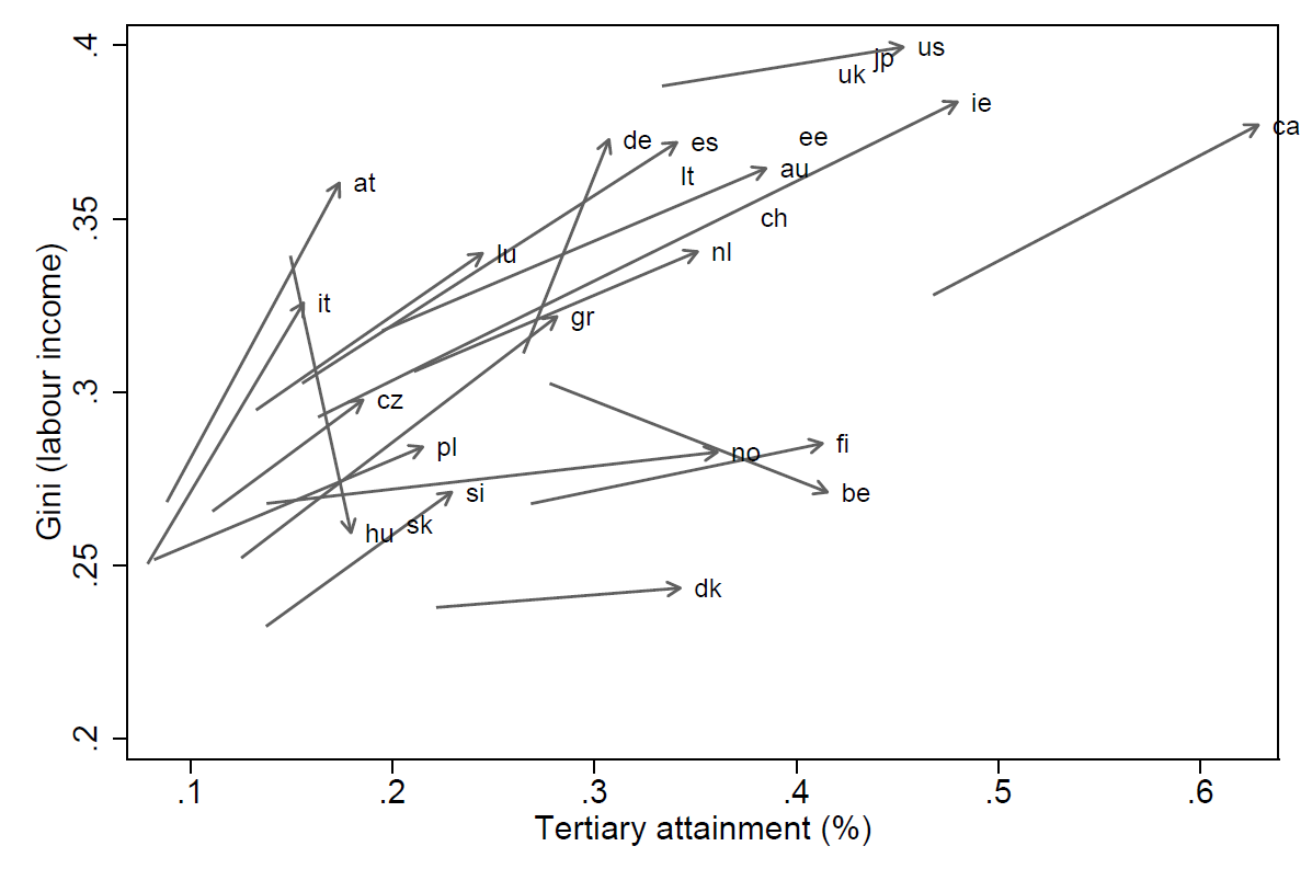 Tertiary education has been expanding in the second half of the 20th century worldwide, and particularly in high-income countries. While higher educational achievement leads to higher earnings for individuals — and is without much of a doubt a “good thing” — what it implies for the overall distribution of labour income is, however, no simple story. It is not at all clear whether educational expansion has been fuelling the growth in income inequality that has been observed in many countries over the last decades or whether, on the contrary, it played a mitigating role.