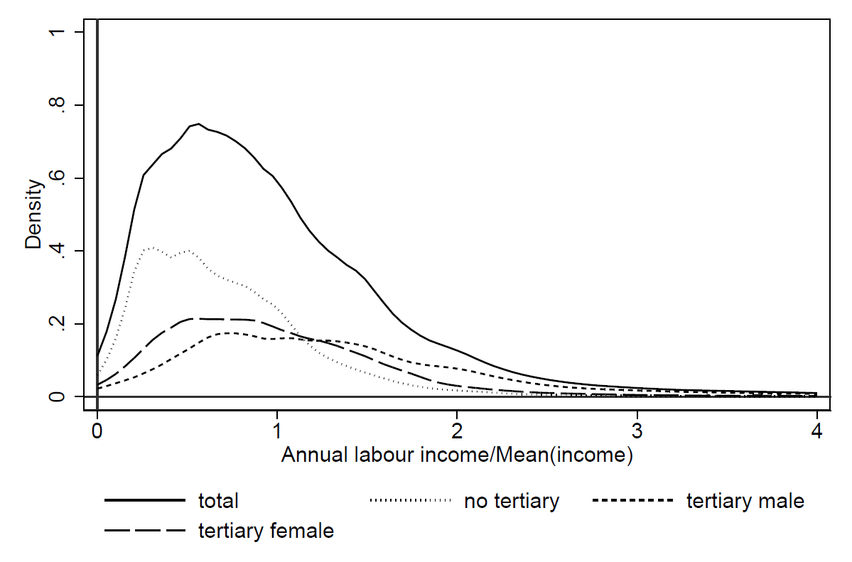 What explains the opposite signs for men and women is the shape of education- and gender-specific income distributions: mechanically, the more tertiary educated men and women contribute to the tails of the distribution (at the top and/or the bottom), the more unequally incomes are distributed among them, and the larger the positive effect is on the Gini coefficient. It is thus the lower income levels of women relative to men and their small contribution to the upper end of the distribution (exemplified in Figure 3) that explains the diverging distributive estimates by gender.