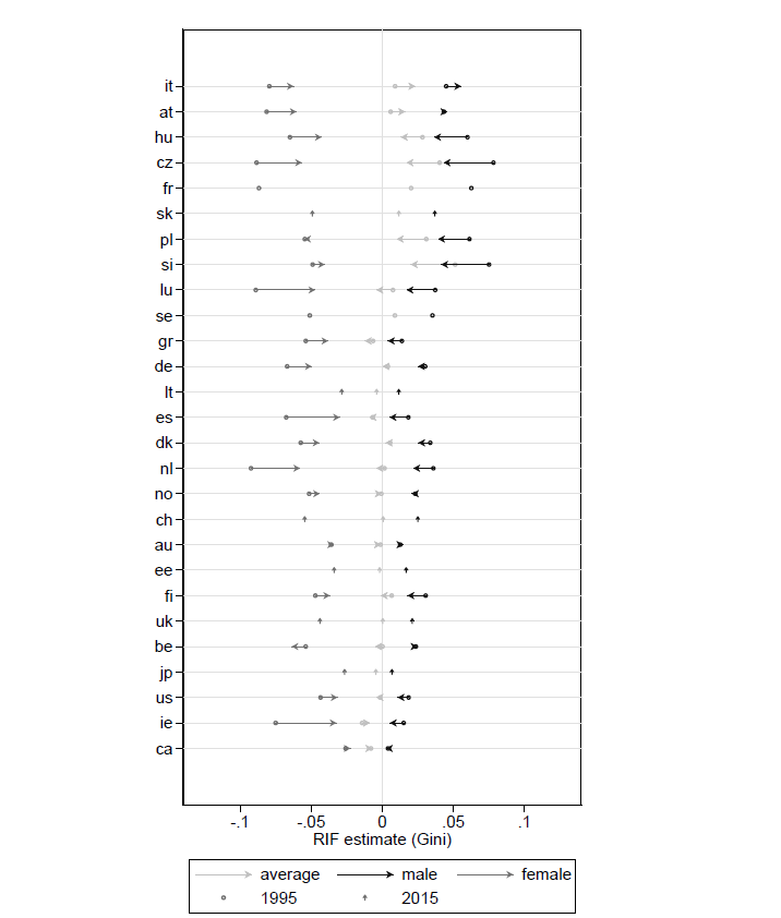 The effect of such density shifts on various inequality measures (or other distributive indicators) is what a technique known as Recentered Influence Function (RIF) regression captures (Firpo, Fortin, and Lemieux 2009; Choe and Van Kerm 2018). We therefore used RIF regressions to project the impact that (marginally) increasing the share of tertiary educated workers, on average and separately for men and women, would have on the Gini coefficient in all 27 countries and for the two time points we have data for. The results are shown in Figure 4. The estimates are scaled such that they can be interpreted as the predicted impact on the Gini coefficient of a 10 percentage point increase in the population share of tertiary educated workers, and a corresponding 10 percentage point decrease in the proportion of non-tertiary educated workers.