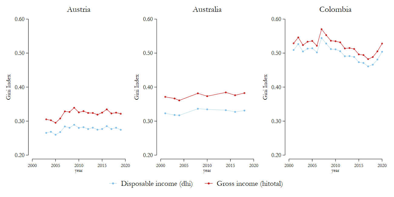 We consider the changes in the Gini Indices for three countries for which LIS provides data on both gross and disposable (net) household income: Austria, Australia, and Colombia (Figure 1). Gross income refers to labour and capital income, contributory pensions, private transfers, as well as transfers received from the state, all before deduction of income taxes and social contributions. The inclusion of social state transfers is particularly important as it means that, compared to market income, gross income already incorporates one of the two main pillars of redistribution in modern welfare states. The second central element for redistribution, taxation, is taken into account in the concept of disposable income, which is obtained by subtracting taxes and social contributions from gross income. In the following, we will refer to the difference between gross and disposable income as tax redistribution.