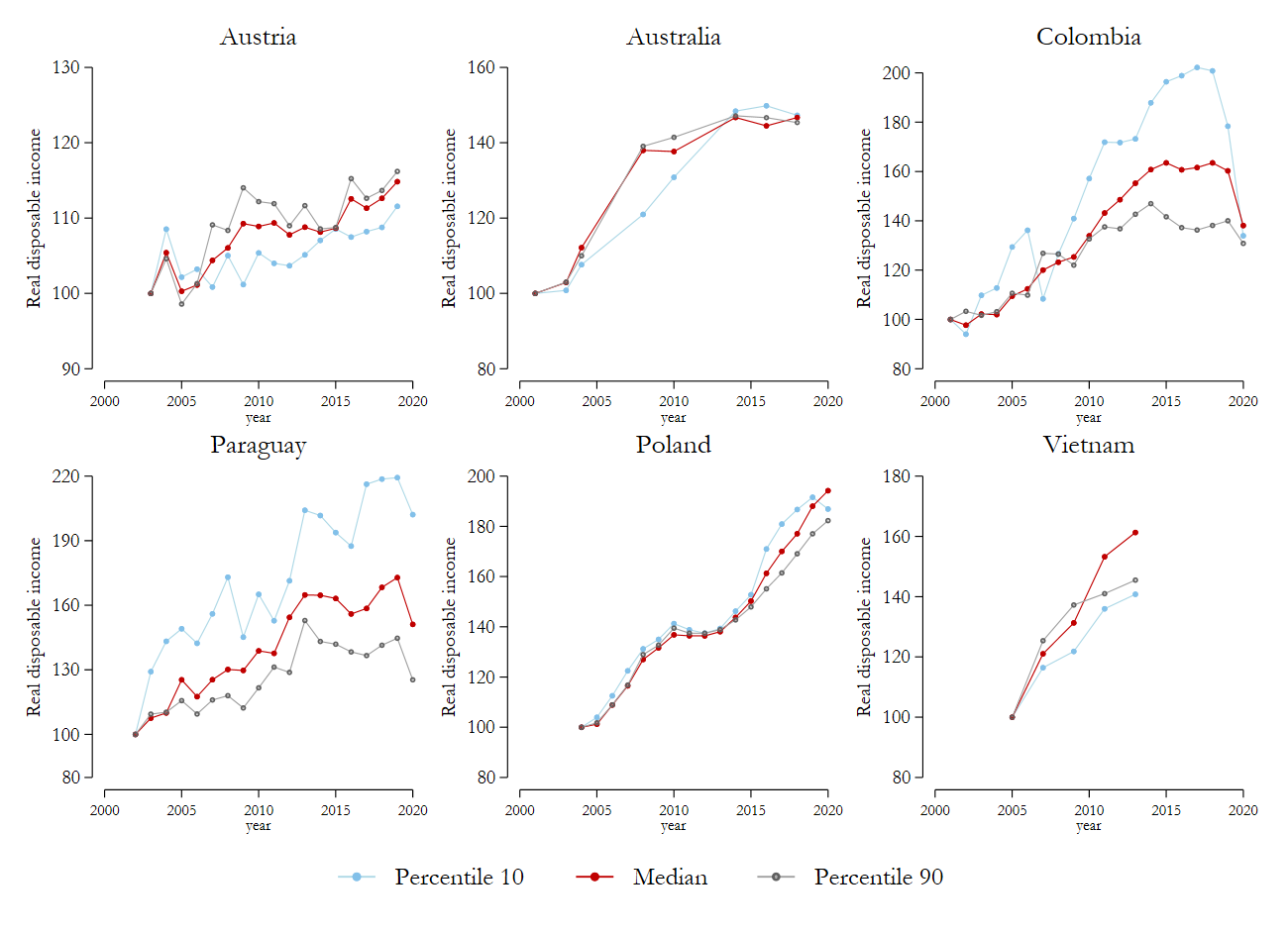 Figure 2 neatly illustrates the very distinctive trends that can be observed across the considered countries. In Poland, for instance, all parts of the income distribution appear to have benefitted from the impressive real growth over the past 20 years to roughly the same degree. Even when growth slowed during the years after the financial crisis, the data suggests that the entire population was impacted to a similar extent. While growth in Australia was not as exceptionally high as in the Polish case and has noticeably levelled off over the last five years, the overall trend in Australia also reveals real growth patterns quite equally spread across the income distribution. However, the financial crisis seems to have had a stronger adverse effect on lower-income Australians compared to the rest of the population. The same can be concluded for Austria, where we can additionally notice a divergence in income growth rates between the median and percentile 90 around the middle of the observed period. Consistent with the generally stable Gini Index shown in Figure 1, however, all parts of the population seem to have benefitted rather equally from the much more moderate growth in Austria when the last two decades are evaluated as a whole.